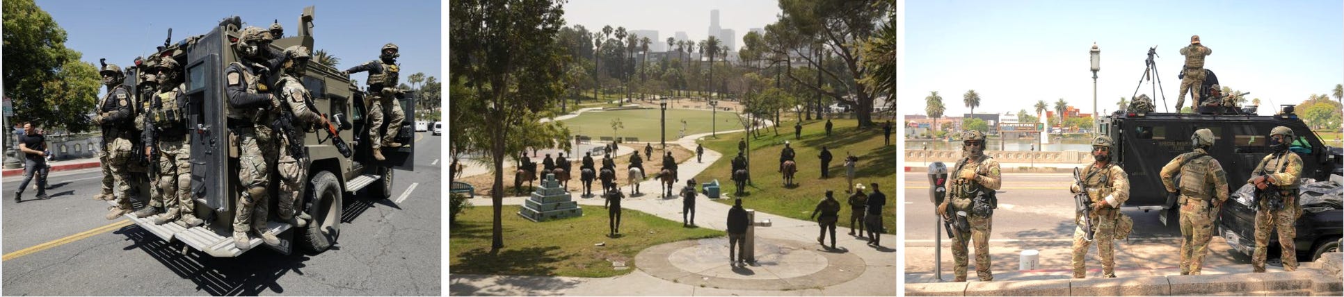 On Monday, dozens of heavily armed Border Patrol, ICE Agents, and 90 National Guard troops descended on MacArthur Park in Los Angeles in armored vehicles and on horseback.